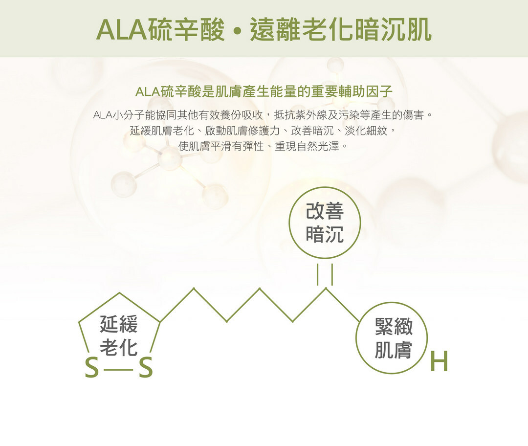 無瑕肌ALA硫辛酸抗暗沉精華 - 協助角質代謝更新,改善膚色不均、暗沉,同時緊緻、撫平、淡化細紋、瑕疵等全方位肌膚功能。適合臉色暗沈,或是油光造成暗沈的型肌膚,2~4週能明顯感受到肌膚重現自然光澤感。