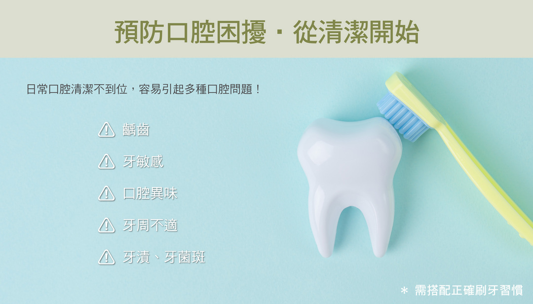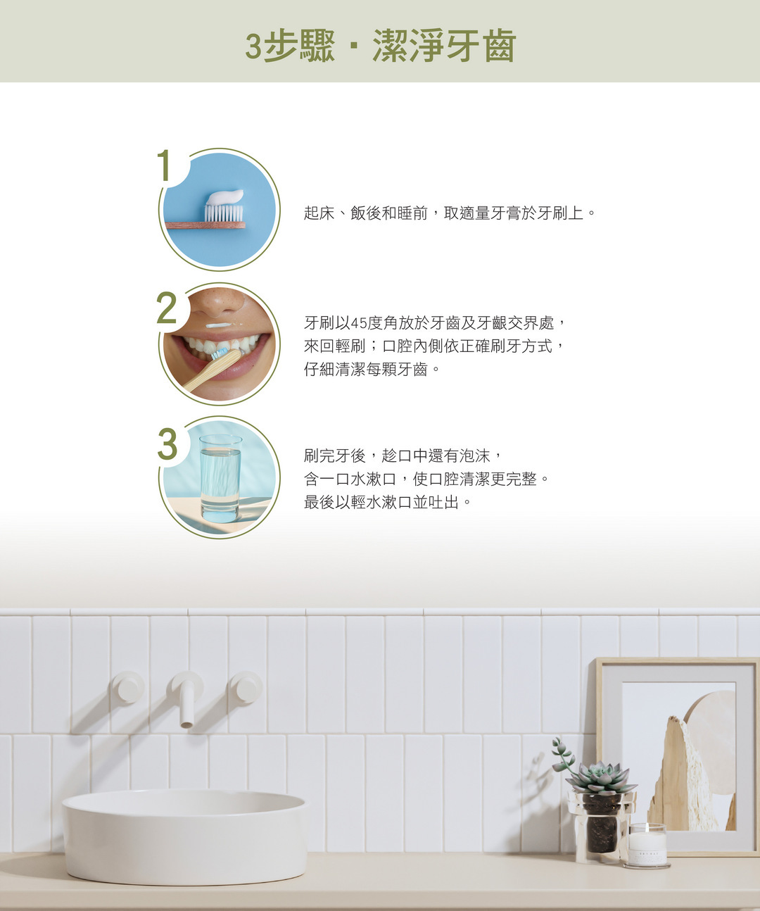 配合牙線使用,選擇合適牙刷,取適量牙膏,正確清潔刷牙,最後可含一口水,當作潄口水使用,全牙周滲透,清潔到位。