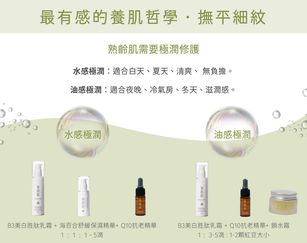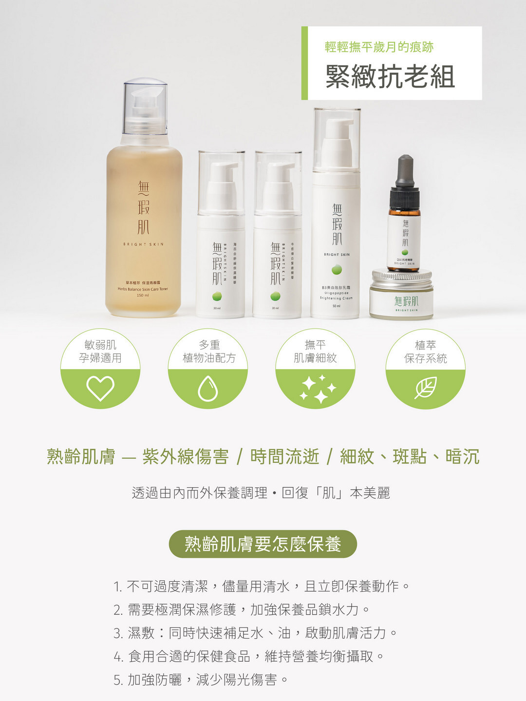 無瑕肌Bright skin緊緻抗老組,客製化有效調控設計+專利亮白胜肽,可依個人肌膚需求 調整保養品保濕力,完整設計可淡化細紋、亮白肌膚、細緻毛孔、均勻全臉膚色、改善暗沉,抵抗因空調及外在環境造成的皮膚傷害、提高夜間強化美顏力,保持肌膚無瑕美肌感。不受溫差、日、夜、季節及年齡變化,不用換保養可以全年使用。