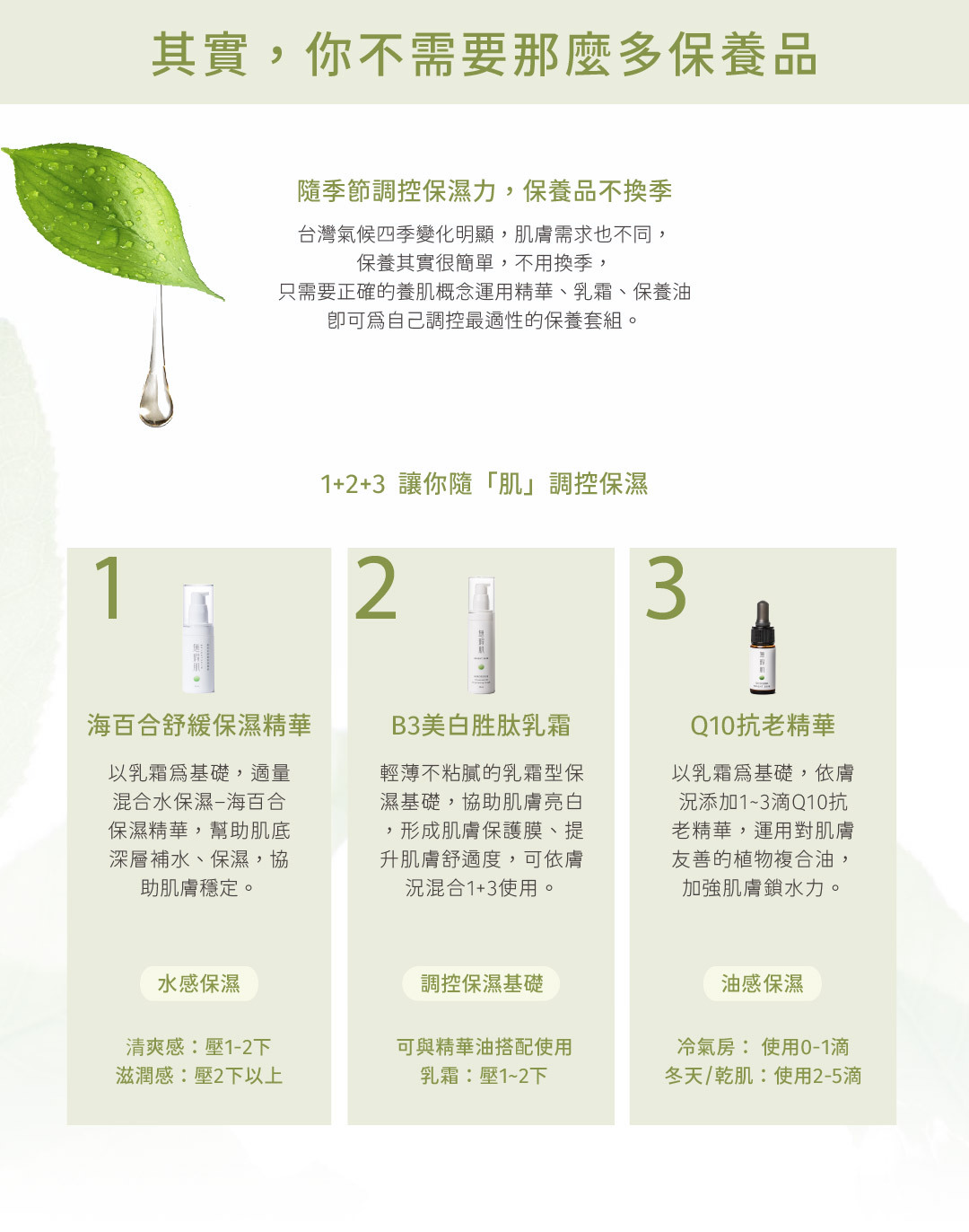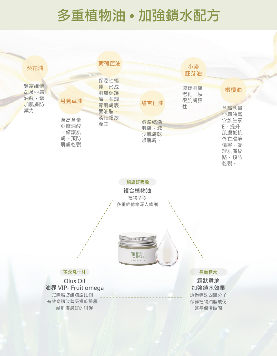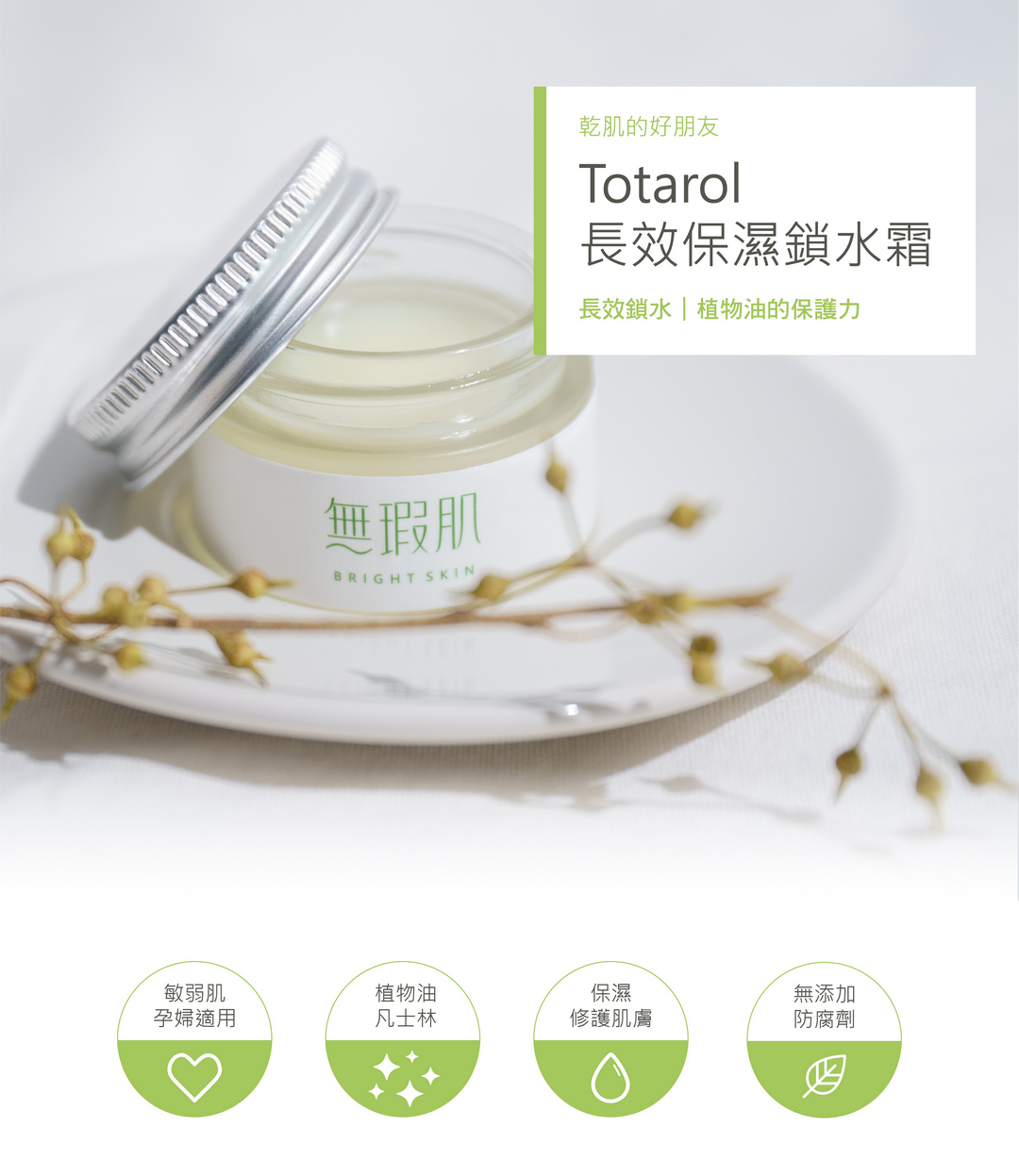 長效保濕鎖水霜 -來自紐西蘭的超級活性成分Totarol,可舒緩肌膚泛紅不適,多重純植物油及強效鎖水設計,在肌膚表面形成保護膜及延長覆蓋時間,提供保濕力、舒緩肌膚紅腫、乾燥、改善乾裂及脫屑。