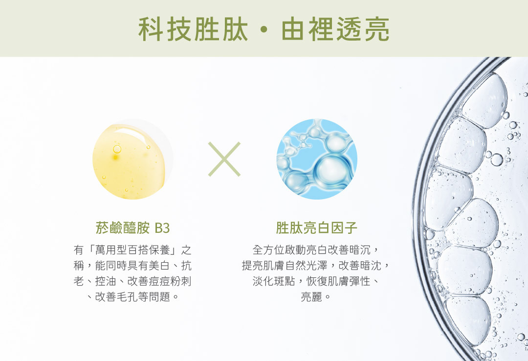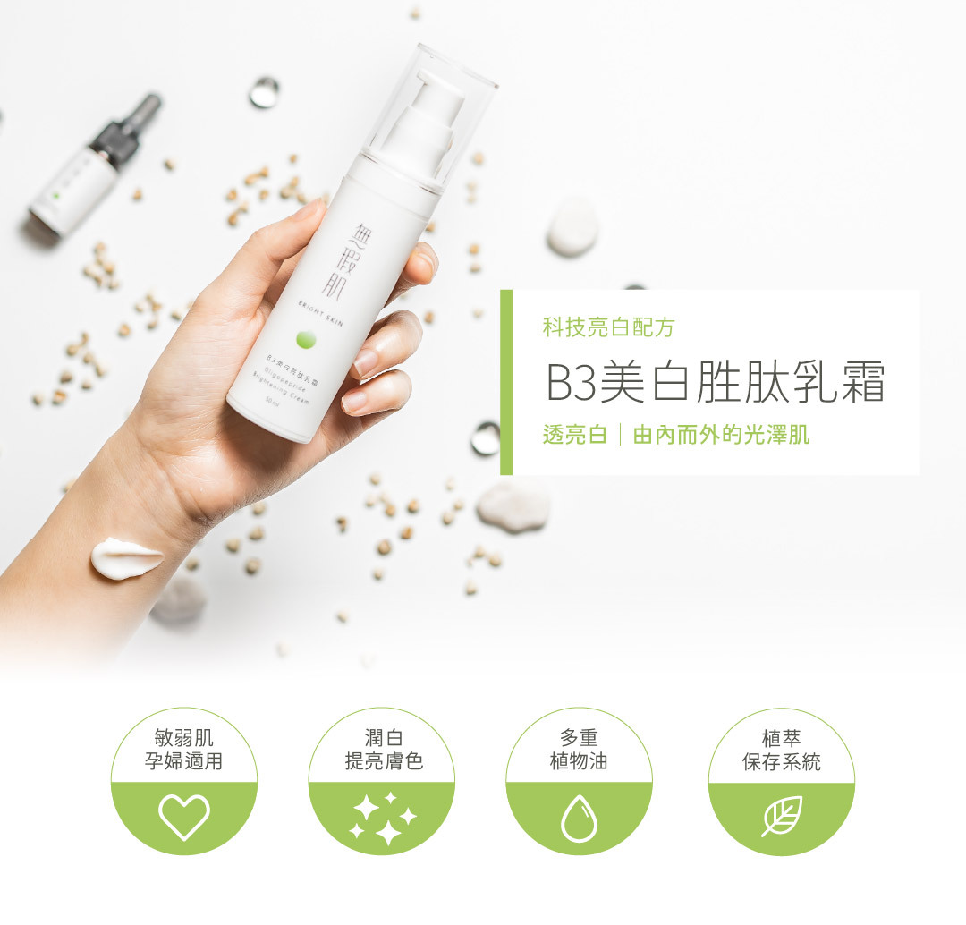 薏仁胜肽亮白乳霜 -美白可以更安全,提供一組創新淡化瑕疵及提亮設計組合,結合養顏的薏仁萃取及生物科技包覆型胜肽美白因子,搭配植物油,協助快速吸收,同時擁有白皙,均勻,亮白膚色多重能力。