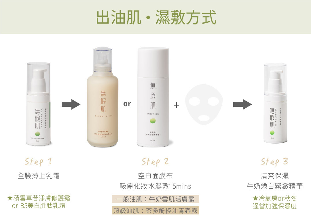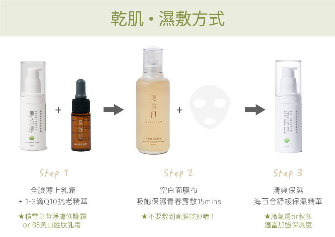 臉部清洗後,請在全臉肌膚薄上淨膚修護霜或胜肽亮白乳霜,面膜布吸飽保濕化妝水後,敷在臉上15-20分鐘,取下後,薄上海百合鎖水,肌膚同時補水補油,提亮飽滿