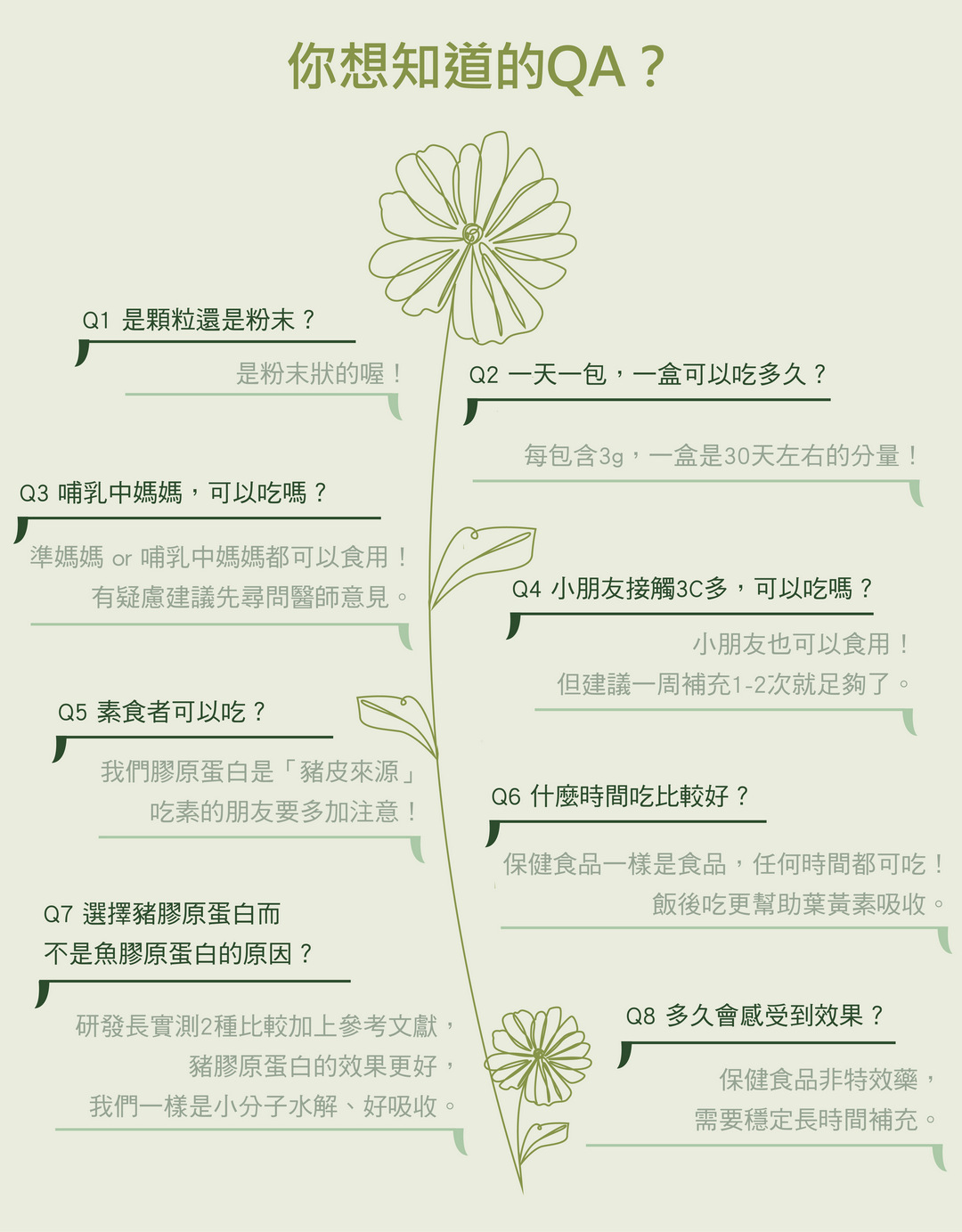 種子保養的金盞花萃取(含葉黃素)複方,含有獨特游離型葉黃素加上蕭玆玉米黃素、高含量花青素的山桑子萃取,搭配幫助肌膚澎潤緊緻的小分子水解膠原蛋白,完美比例搭配,讓每個成份相相互加分;不添加任何賦形物,只保留你所需要的養分。同時擁有晶亮清晰及美麗。