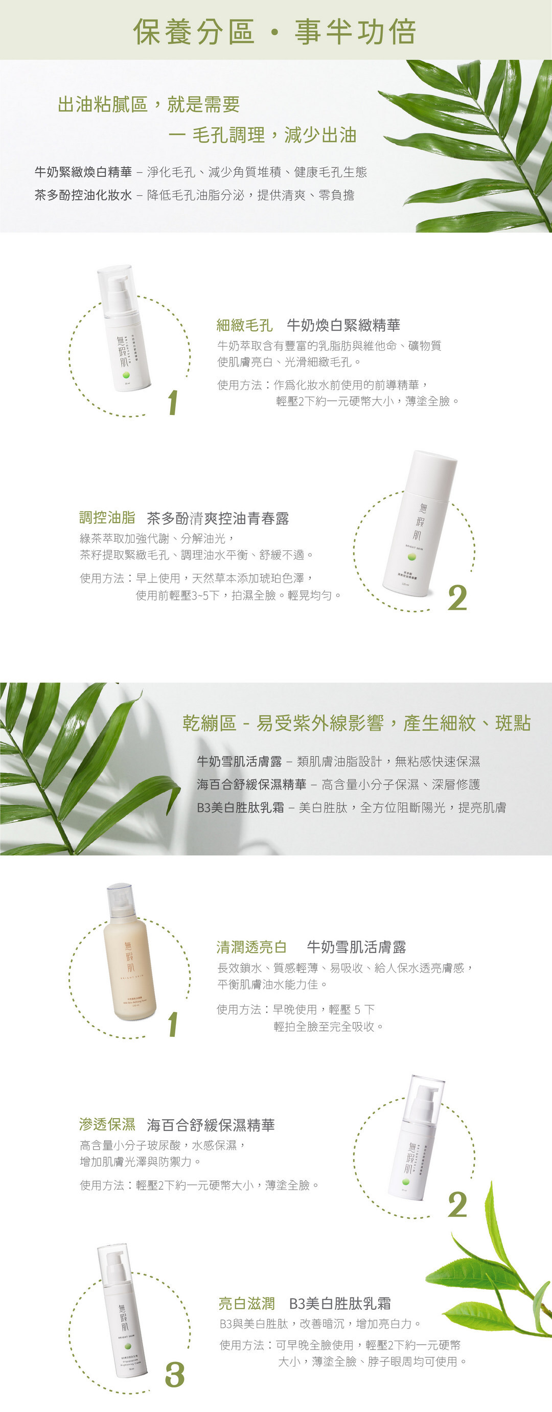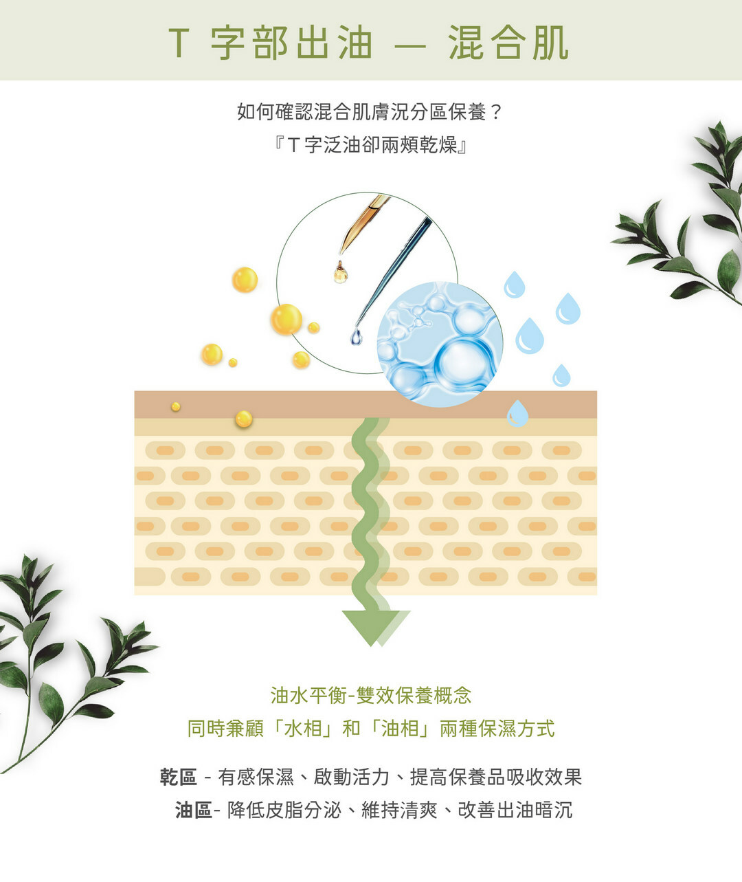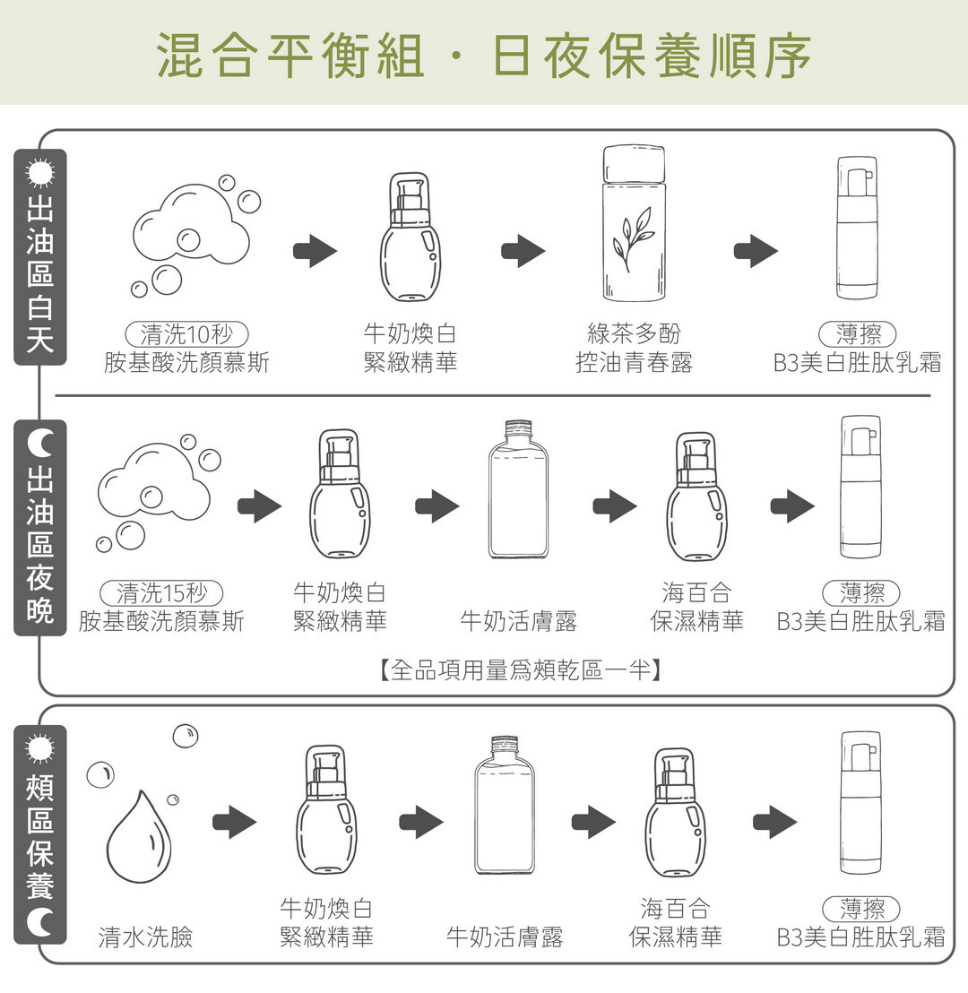 1.油區保養:清爽不粘膩,配合晚上肌膚休息時強化保濕力,提高油水平衡,改善出油及缺水膚質。
