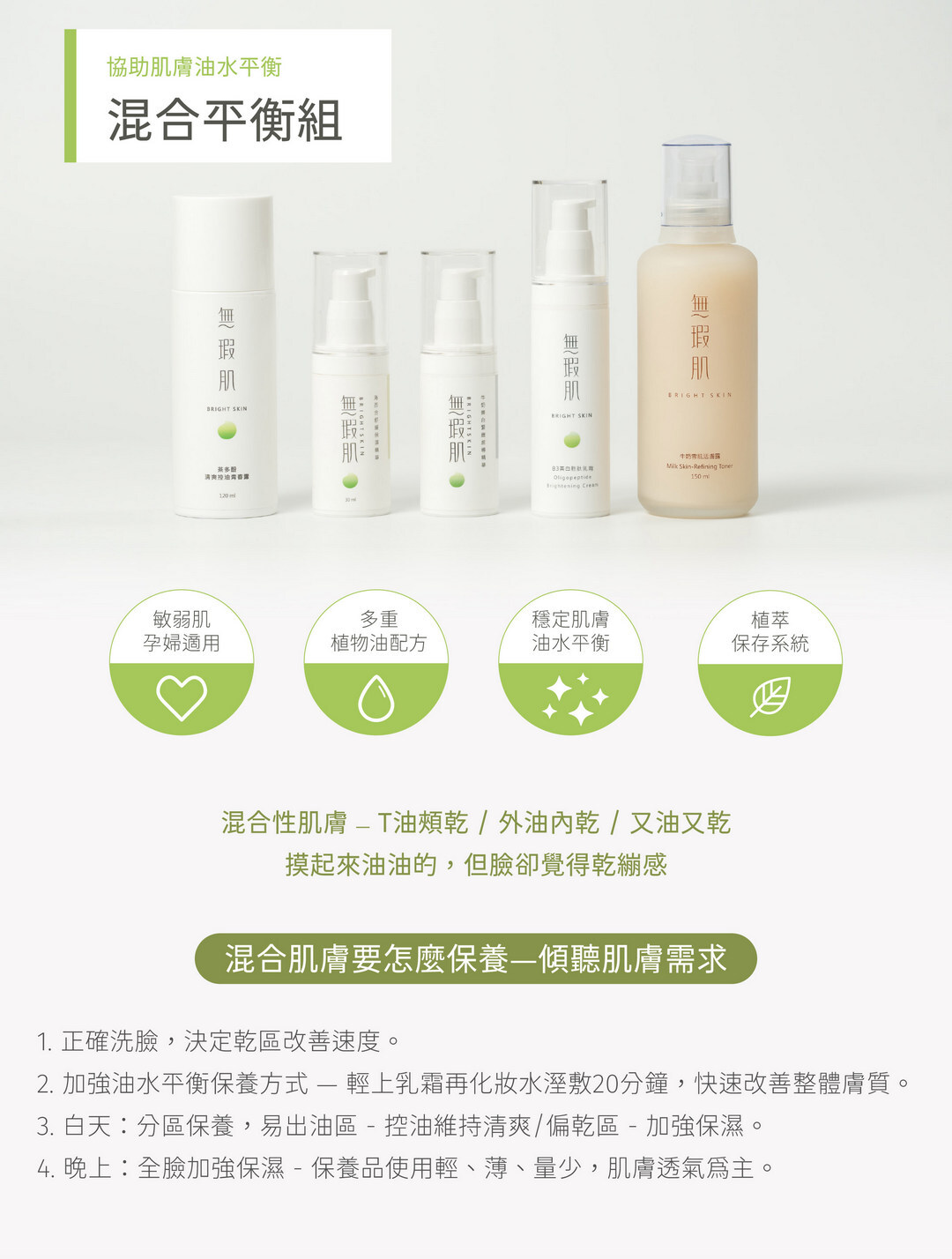 無瑕肌Bright skin混合平衡組,對T油頰乾提供分時、分區保養概念。