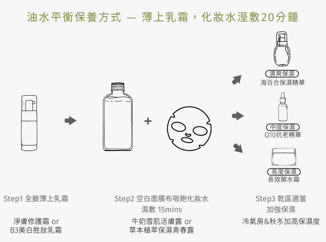 3.搭配溼敷,同時補油補水,減少出油、增加保水度、均勻膚色,達到油水平衡增加肌膚自我保護力。。