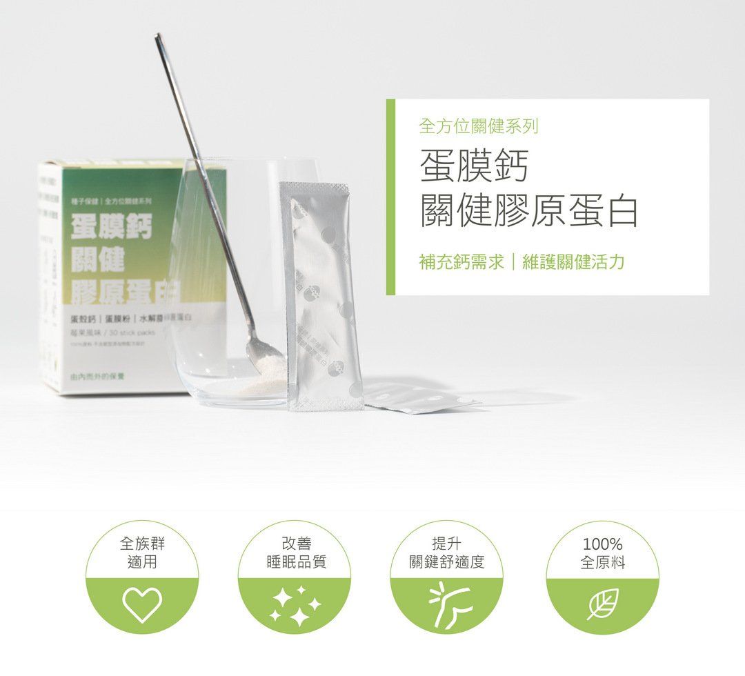 種子保健蛋膜鈣關健膠原蛋白,100%純成份設計,享受健康無添加任何賦形物,雙倍健康(補鈣+關鍵力)市場唯一雙效配方設計,產品力四倍高CP。