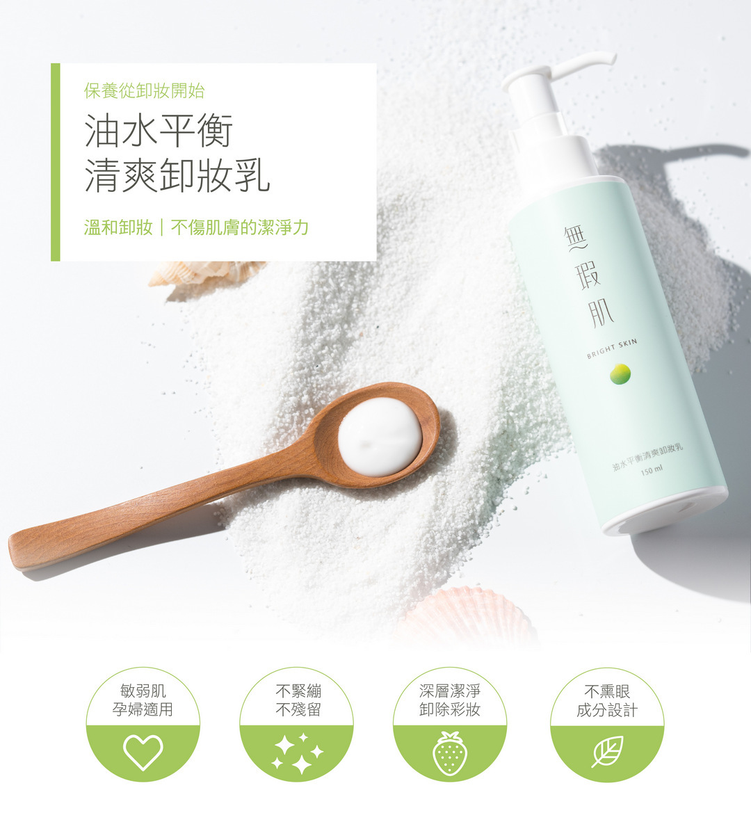 無瑕肌Bright skin油水平衡清爽卸妝乳 - 不含界面活性劑,排除致粉、痘成分設計,清爽食用油脂,快速溶妝原理,有效溶化毛孔髒污,卸除彩妝,呈現保濕柔細膚感。
