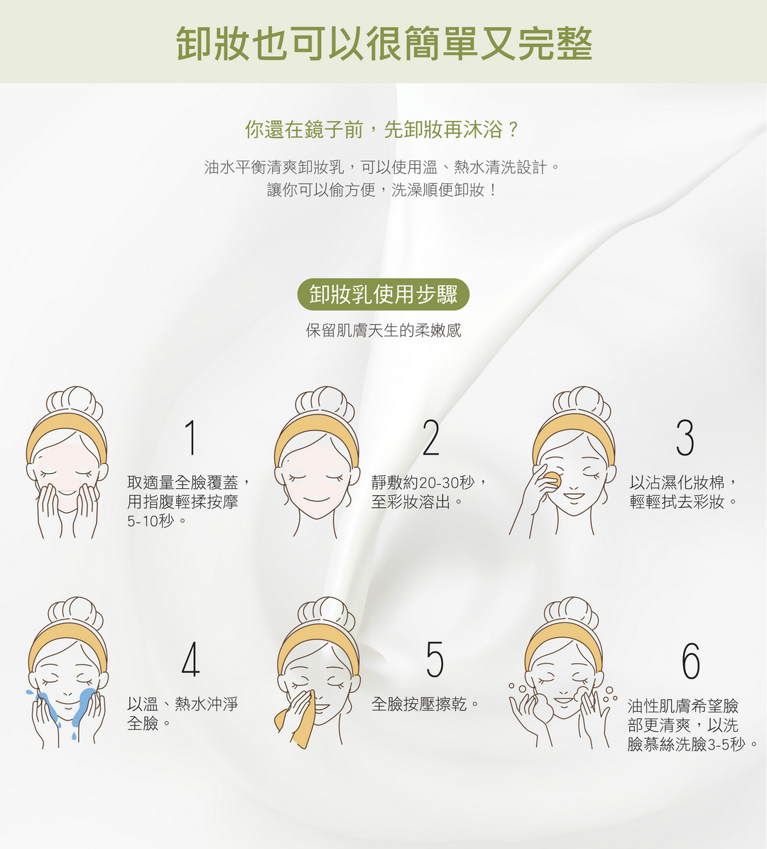 濃、淡妝及防曬,均可適用輕揉全臉5-10秒,靜置約30秒,壓二下洗臉慕絲輕按摩5-10秒,再清水沖淨。若想要更清爽膚感,可以再用一下洗臉慕時洗3-5秒。