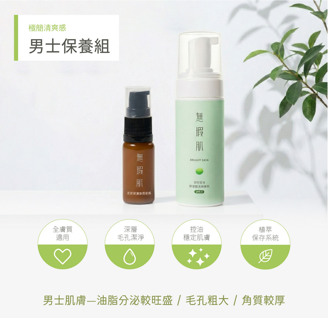 無瑕肌Bright skin 男士保養推薦組合,保養不需要複雜,只要做對這兩步。專為男士肌膚設計,解決「表面出油、肌底乾渴」的失衡狀態,讓你出門一整天臉不油。