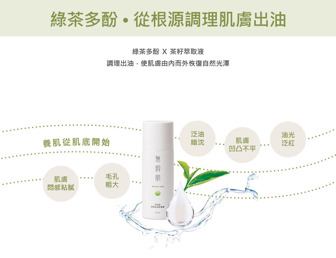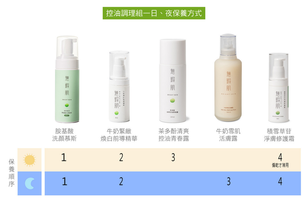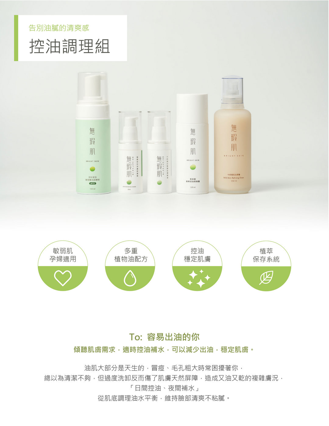 無瑕肌Bright skin控油體驗組,適合易出油性肌膚,協助控住過多油脂分泌、減少臉部油光、改善臉色暗沈 及妝感不易持久、油脂造成的粘膩、悶感困擾。
