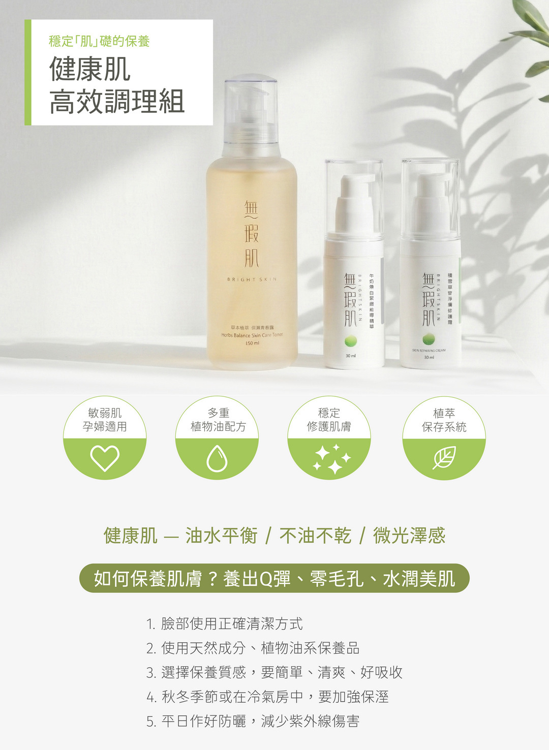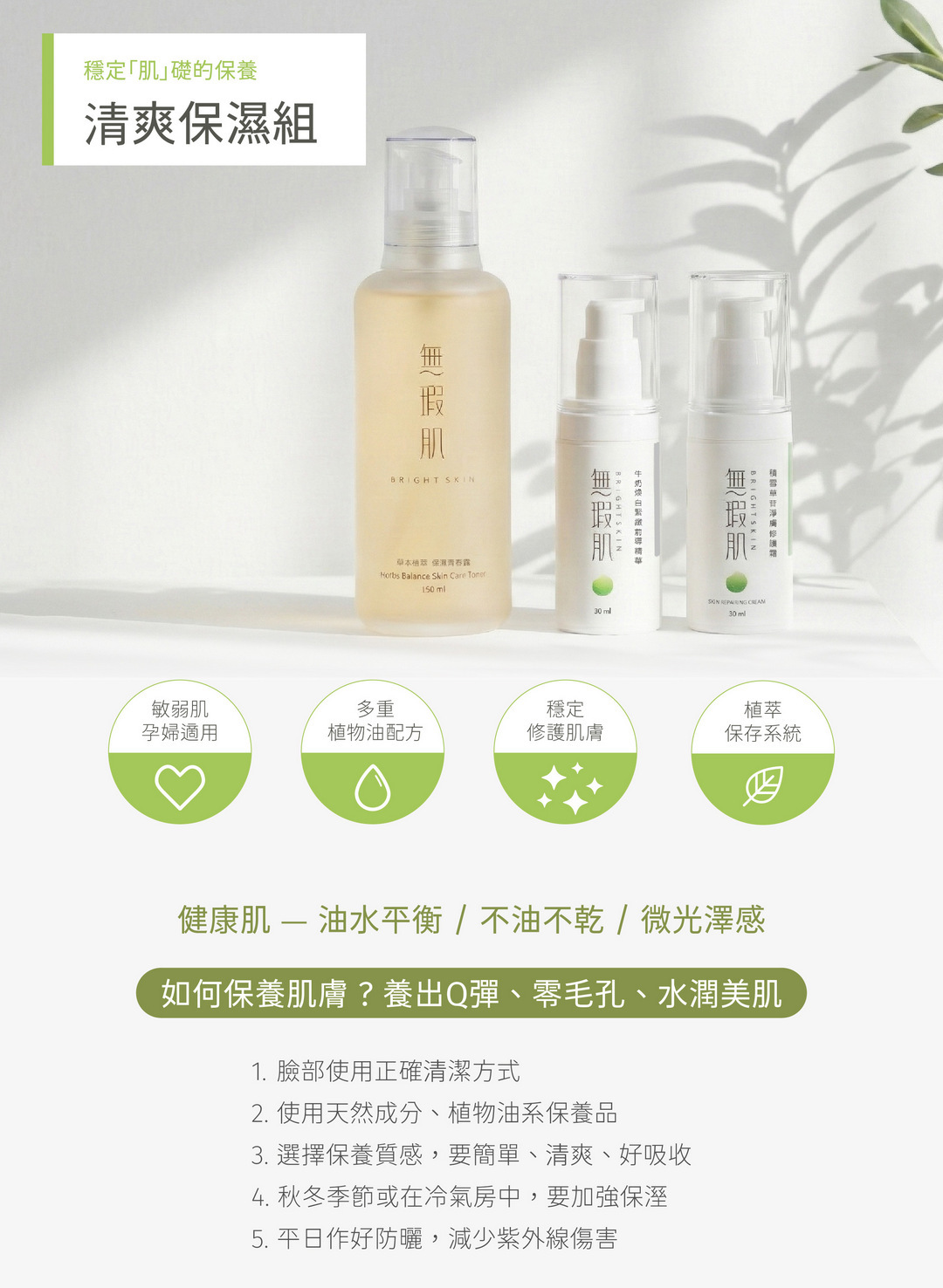 無瑕肌Bright skin客製化清爽保溼組,提供清爽油脂及適當保濕水份,維持肌膚天生油水平衡,清爽保溼、質感不粘膩、無負擔質感。屬簡單基礎保養 適合不油不乾、健康、穩定、無肌膚困擾、年輕膚質使用。
