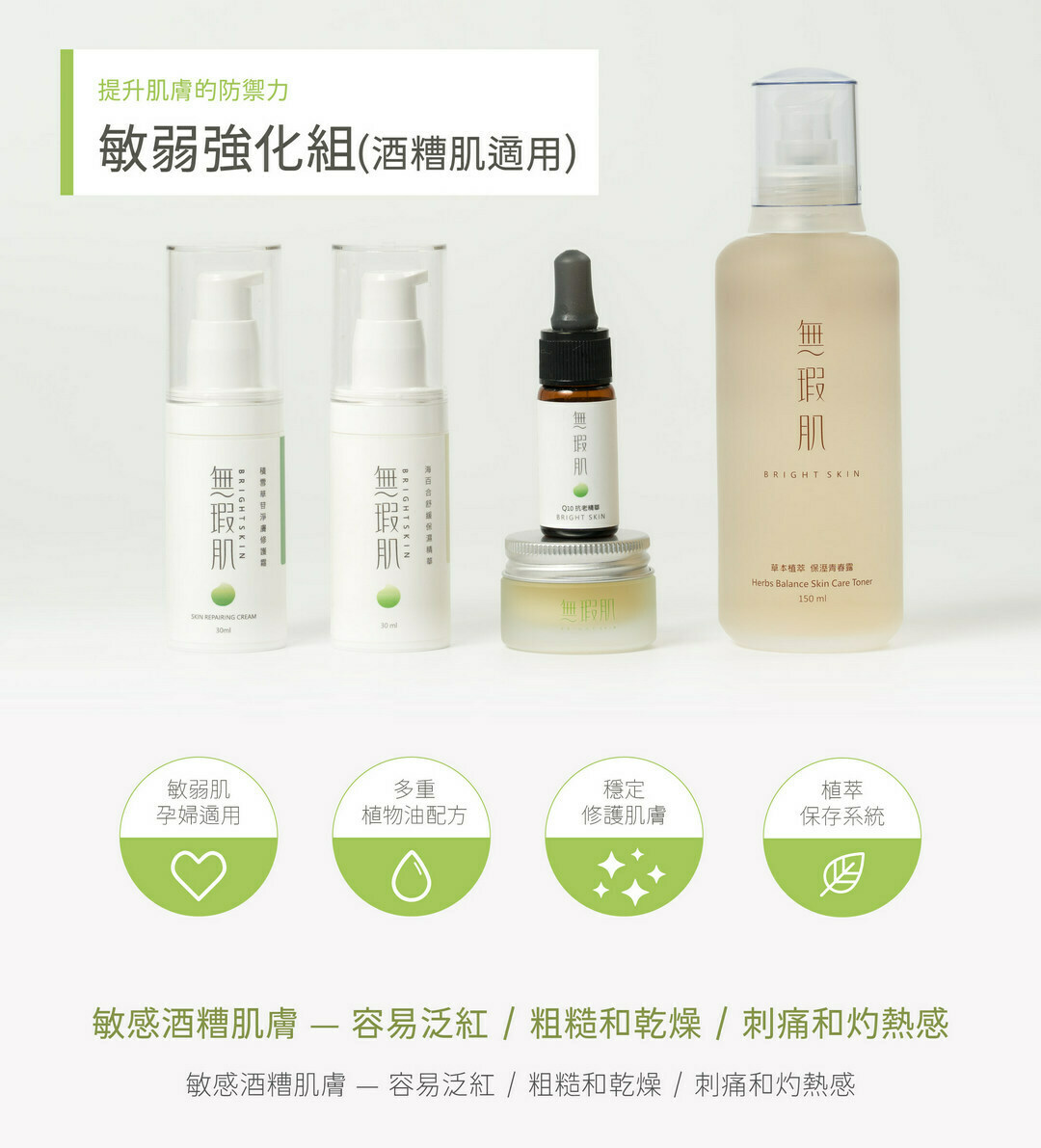 無瑕肌Bright skin 敏感肌保養推薦組合-敏弱強化組,舒緩肌膚易敏、泛紅、乾癢、乾渴粗糙、顆粒不平整,搭配溼敷設計,快速急救補水,提供有感保溼持續力,賦活肌膚滋潤含水,日間舒緩乾感不適,夜間長效高效保溼設計八小時到天亮,增加肌膚自我保護力,有效抵抗外在環境傷害力。