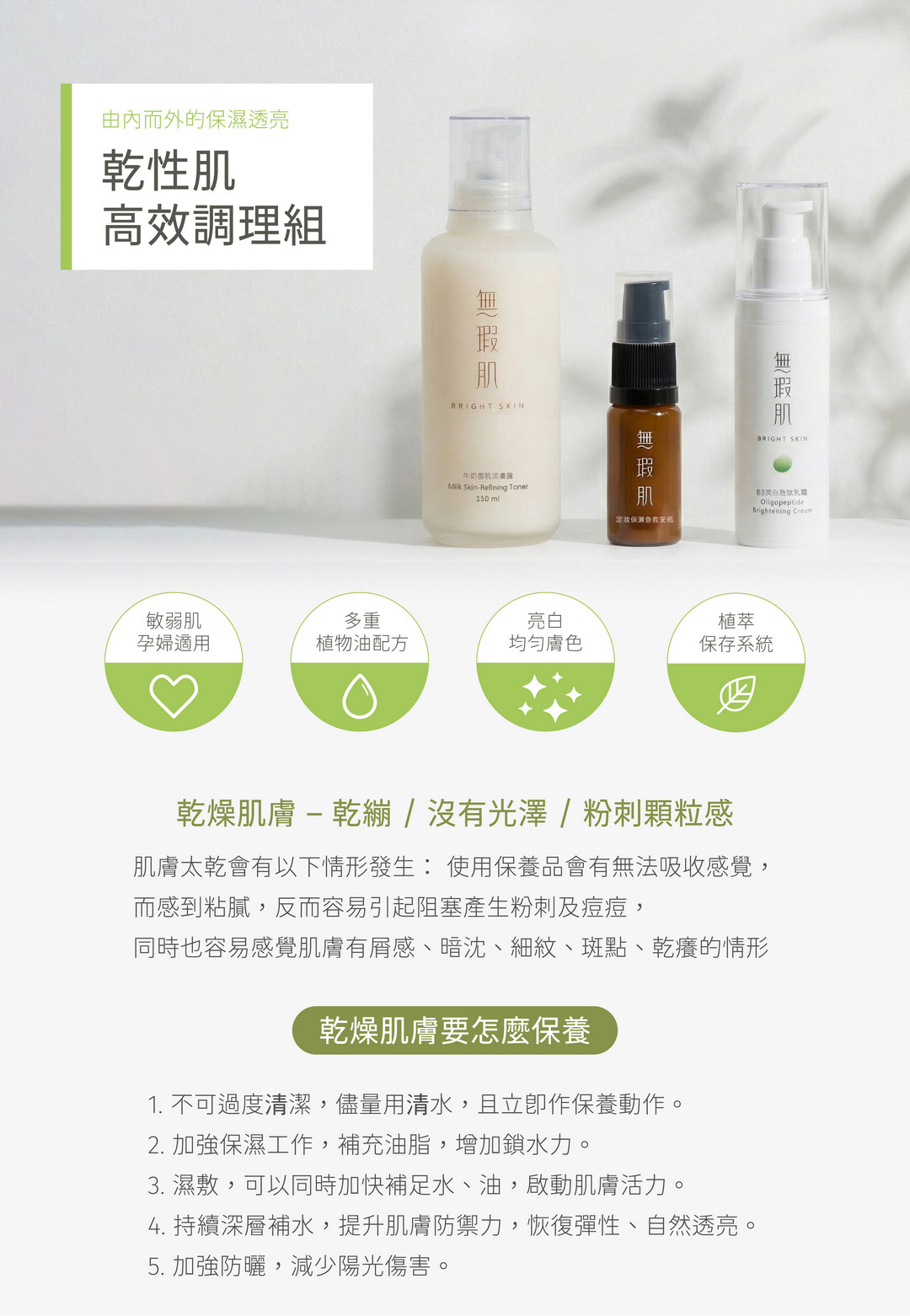 無瑕肌Bright skin乾性肌高效調理組,從安瓶的強效灌溉,到牛奶露的溫柔潤澤,最後用胜肽霜封存所有亮白精華,不再因為乾燥而顯老。B3與胜肽的黃金組合,幫你均勻全臉膚色,收斂毛孔。