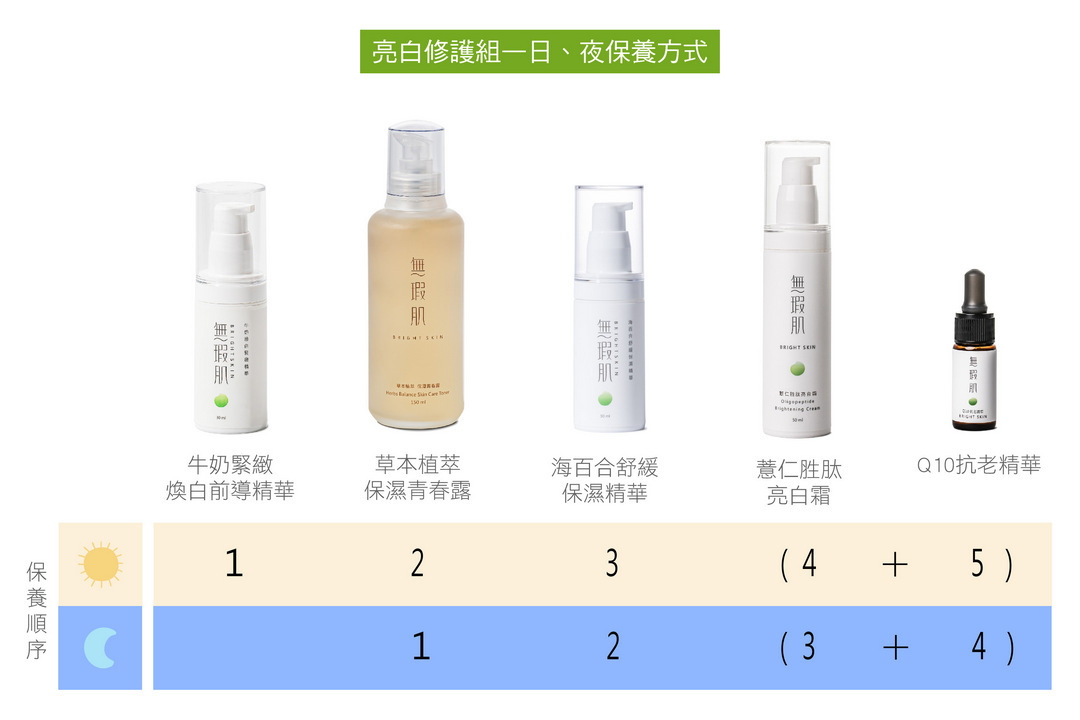 無瑕肌Bright skin客製化乾肌修護體驗組,搭配專利亮白胜肽,亮白肌膚、細緻毛孔、均勻全臉膚色、改善暗沉,日、夜、全年均可使用,不用擔心陽光反黑,首創客製化有效調控保溼設計,可依膚質及季節需求,自我決定乳霜滋潤度,換季不用換保養品,全年可以使用。